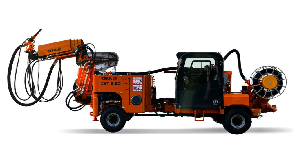 Una pluma recientemente concebida, diseñada y construida completamente por CIFA, y exclusivamente pensada para la minería y los túneles de pequeñas dimensiones. Robusta y al mismo tiempo versátil y precisa en los posicionamientos de la tobera de trabajo, alcanza alturas de trabajo hasta los 10 metros. La máquina tiene una característica única: la pluma puede ser abierta una vez alcanzada la zona de trabajo quedan todavía en modalidad «carro» o sea alimentada por el motor Diesel. La pluma, además, tiene en dotación una rangua de eje horizontal, que permite al operador realizar el perfil completo del túnel con un solo movimiento del joystick posicionado en el control remoto proporcionado. El chasis articulado con una articulación central, conjuga dimensiones reducidas y alta maniobrabilidad. La altura al suelo y los amplios ángulos de ataque, delantero y trasero, permiten afrontar con gran agilidad los terrenos accidentados típicos en la minería y tunelización. La posición de manejo rota 180°. La pluma, el chasis, el grupo de bombeo y el sistema de dosificación de aditivos UNIFLUX H 1.0 son diseñados, desarrollados y construidos completamente por CIFA y representan la sinergia ideal para garantizar a los clientes el mejor rendimiento en la minería y tunelización en cada obra.